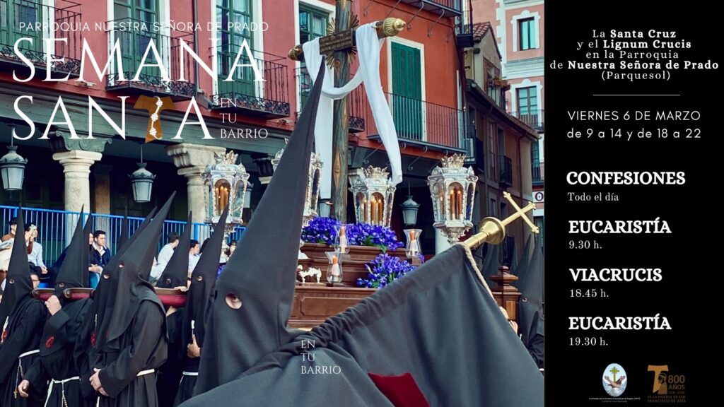 El Lignum Crucis y la Santa Cruz visitan la Parroquia de Nuestra Señora de Prado en Parquesol en una jornada histórica. La Semana Santa vuelve a cruzar el Pisuerga para acercarse a los barrios de la ciudad. Desde las 9:30 hasta las 22:00 la Parroquia de Nuestra Señora de Prado será la casa de los Franciscanos.