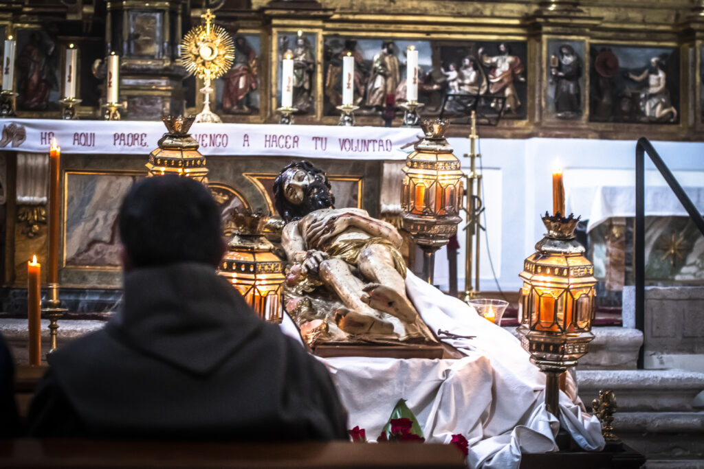 24 horas ininterrumpidas de oración ante el Santísimo. Consultad los turnos de vela en el tablón. Se puede acudir con hábito (sin capirote) o medalla.