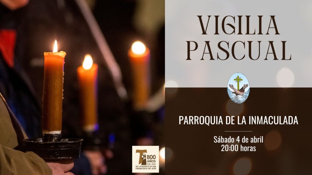 A las 20:00 horas comenzará la Vigilia Pascual en la Iglesia Parroquial de la Inmaculada. Al finalizar, y en la cripta del convento, tendrá lugar una sencilla fiesta fraterna para celebrar el día más importante del año para los cristianos