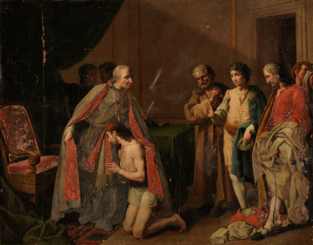 Cubierto de andrajos marcho por el bosque alabando a Dios y a pesar de que fue maltradado por unos bandoleros, continúo su caminar hasta que llegó a un monasterio en el