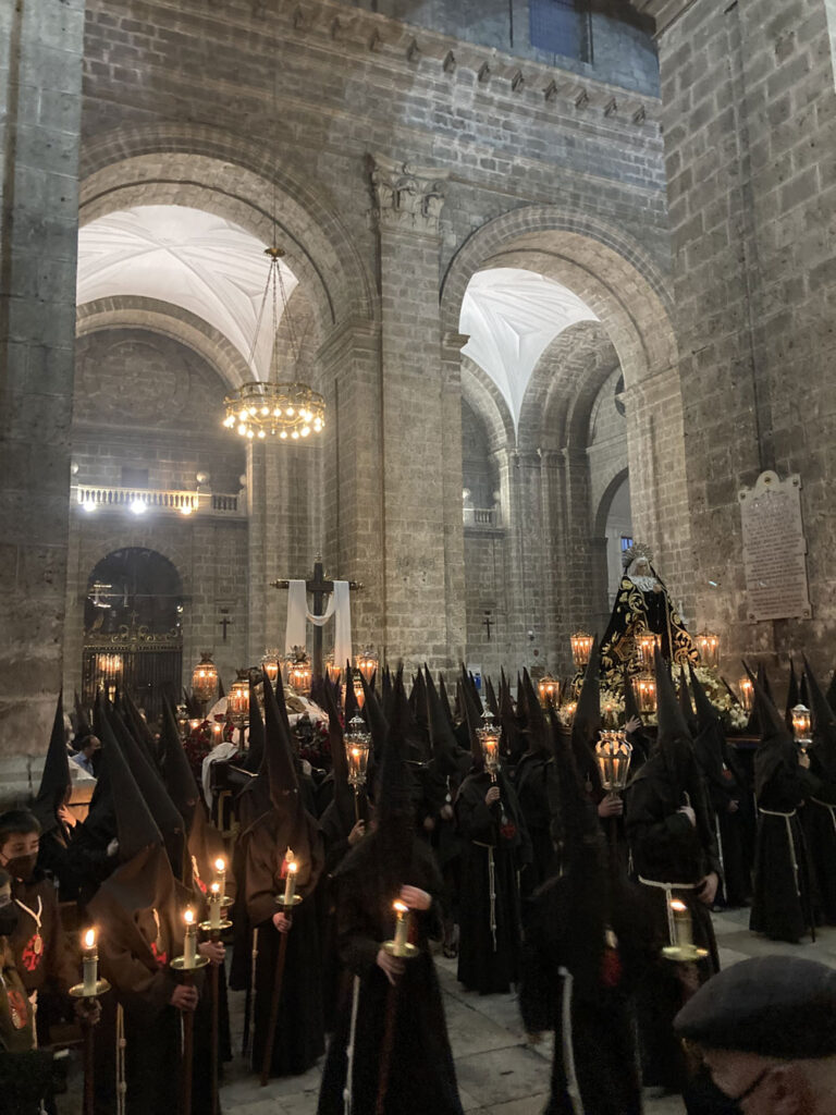 Al término de la procesión y tras la recogida de los pasis en la Iglesia del Convento de Santa Isabel de Hungría junto a nuestras Hermanas Clarisas, los comisarios que han cargado las imágenes realizan una última estación postrados de rodillas ante el Santísimo en un acto íntimo y culminante.